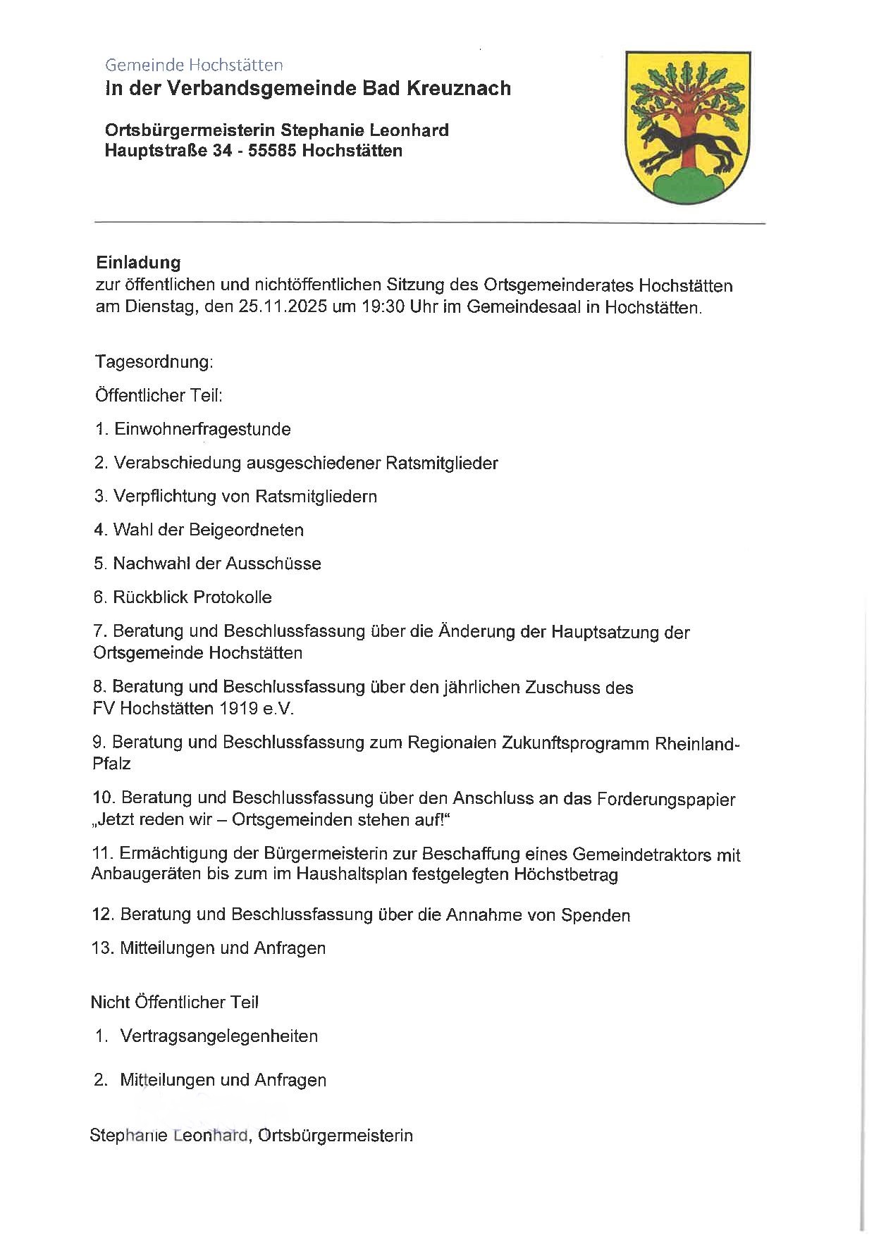 Dienstag, 06.11.2018: Einladung zur Gemeinderatssitzung Hochstätten, um 19.30 Uhr im Dorfgemeinschaftshaus