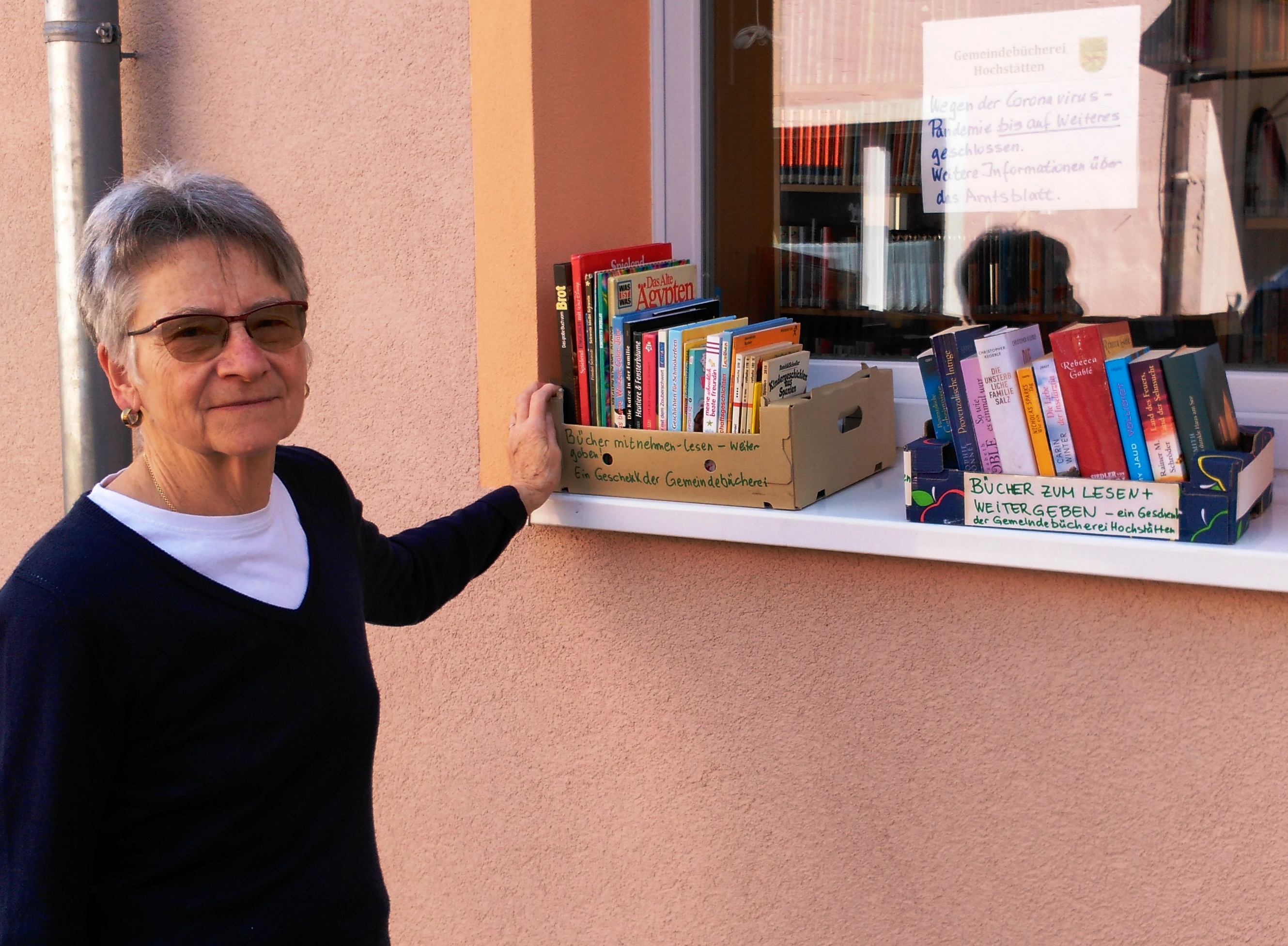 Wenn auch die Gemeindebücherei Hochstätten wegen der Coronavirus-Pandemie derzeit bis auf Weiteres geschlossen ist, so gibt es doch auch jetzt ein kleines, kostenloses Angebot: Auf der Fensterbank der Bücherei am Rathausplatz sind zwei Kisten mit Büchern zu finden, bei denen man sich bedienen kann. Ausgesonderte und gespendete Bücher aus allen Bereichen sind dort zu finden. „Mitnehmen-Lesen-Weitergeben“ ist das Motto. Elke Heil, die ehrenamtliche Leiterin der Gemeindebücherei, stellt hier das Angebot vor. Kontakt:
