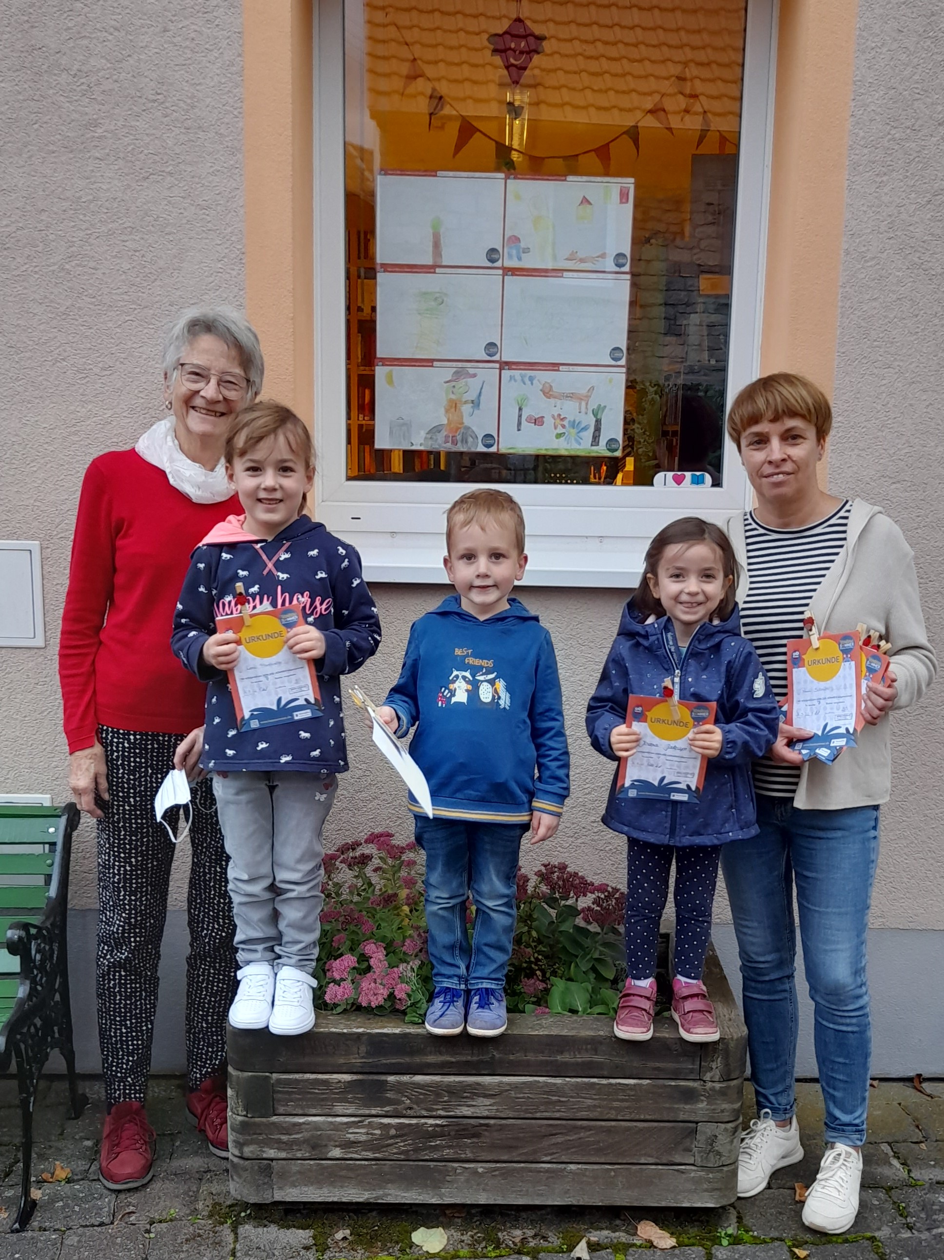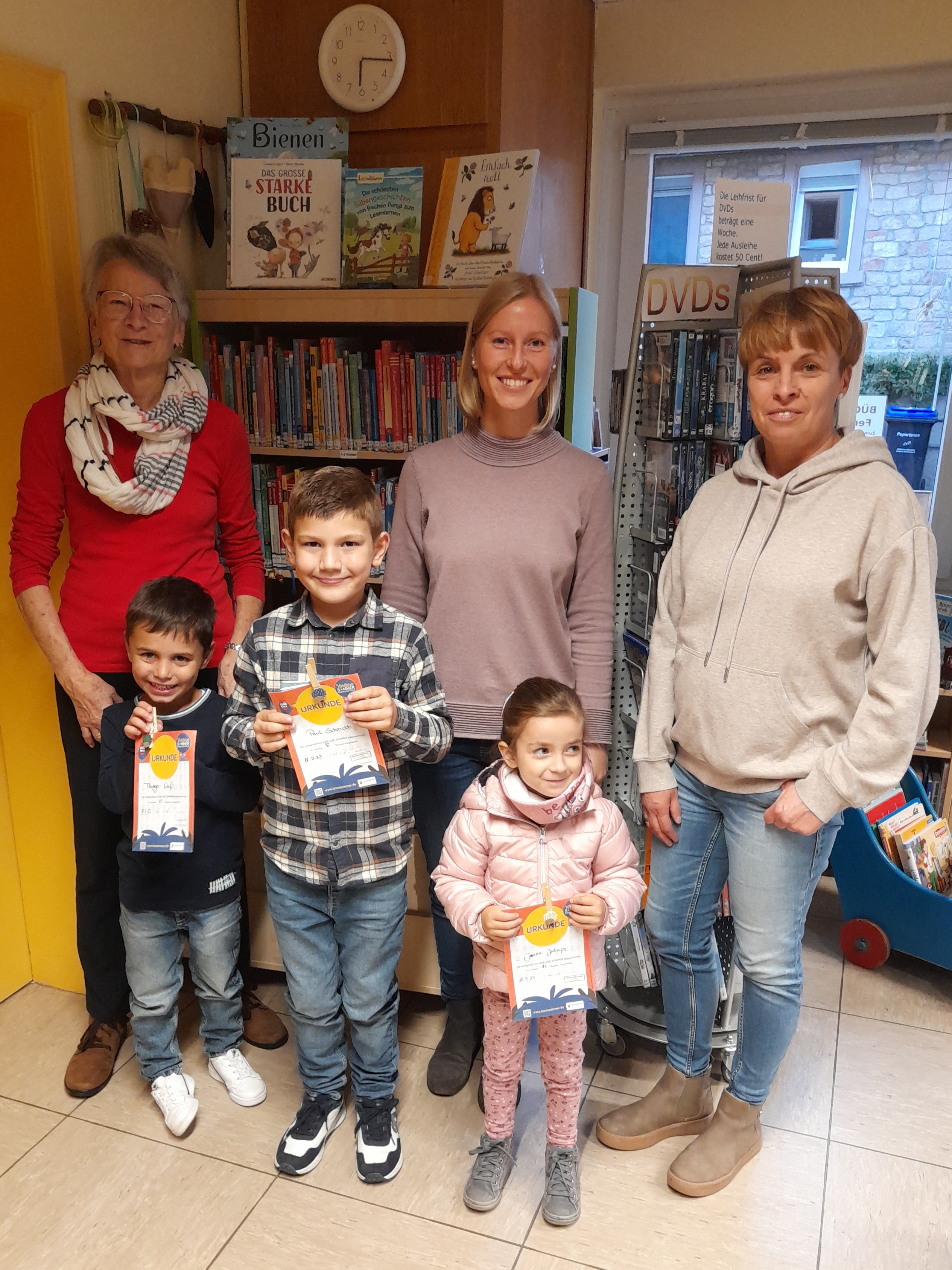 Oktober 2023: Zum Abschluss des Vorlesesommers, an dem sechs Kinder aus Hochstätten teilgenommen hatten, kamen drei Kinder vorbei. Sie erhielten ihre Urkunden und ein kleines Geschenk. 76 Bücher wurden von Eltern, Großeltern, Geschwistern oder Onkeln und Tanten vorgelesen. Für alle Büchereibesucher an diesem Tag gab es anschließend die Kamishibai-Vorführung von „Frederick“.