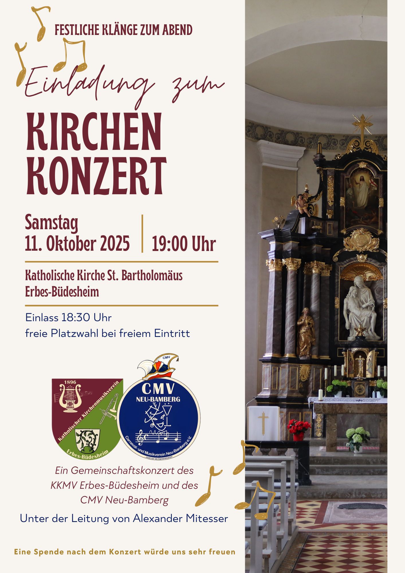 Samstag, 11.10.2025 um 19:00 Uhr: Kirchenkonzert des CMV Neu-Bamberg und des KKMV Erbes-Büdesheim in der Kath. Kirche in Erbes-Büdesheim