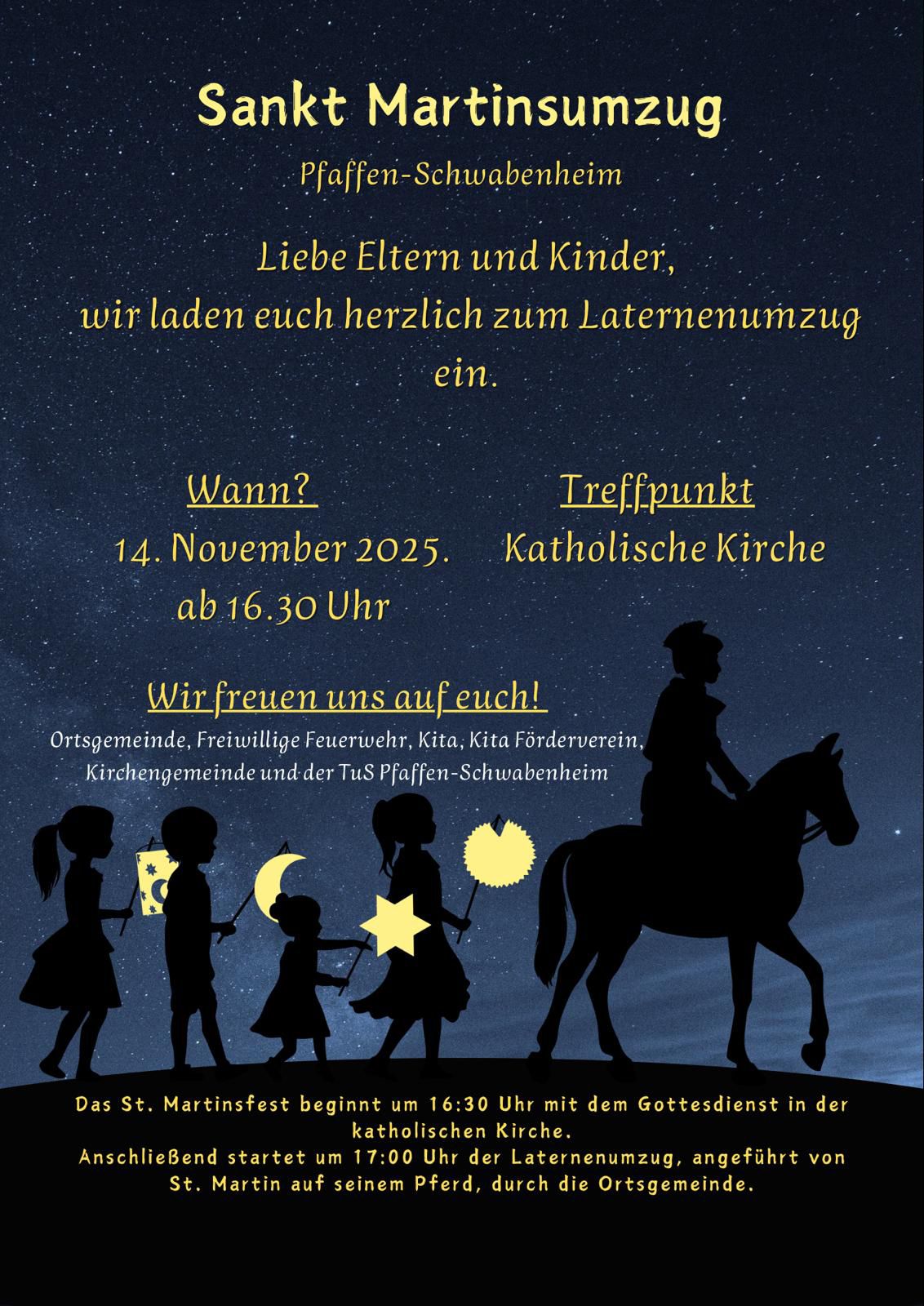 Freitag, den 14.11.2025 um 16:30 Uhr: St. Martinsumzug Pfaffen-Schwabenheim - Beginn an der Kath. Kirche Pfaffen-Schwabenheim
