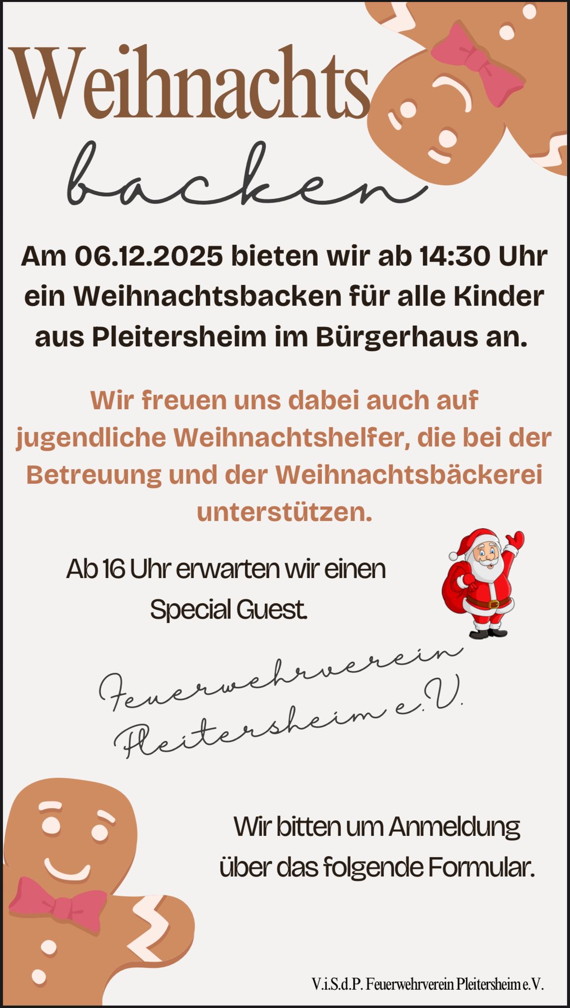 Samstag, 06. Dezember 2025 ab 14:30 Uhr: Weihnachtsbacken im Bürgerhaus Pleitersheim des Feuerwehrvereins Pleitersheim e. V.