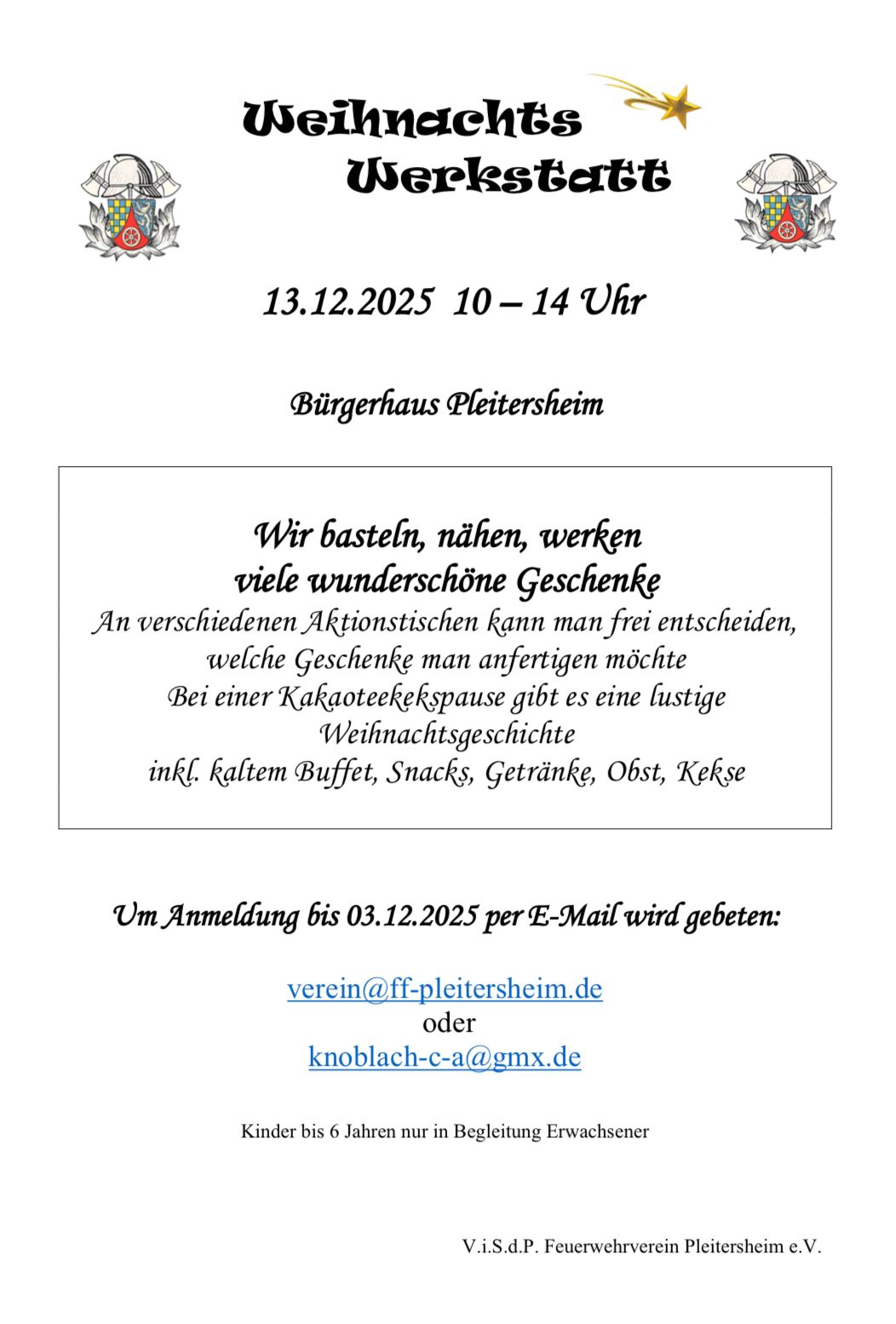 Samstag, 13. Dezember 2025 von 10:00 Uhr - 14:00 Uhr: Weihnachtswerkstatt des Feuerwehrvereins Pleitersheim e. V. im Bürgerhaus Pleitersheim
