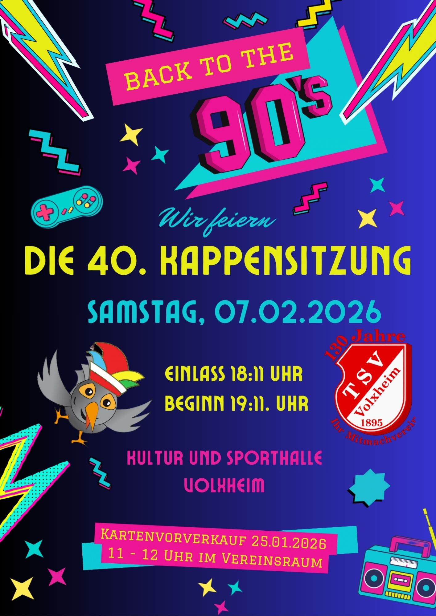 Samstag, 07.02.2026 um 19:11 Uhr: 40. Kappensitzung "Back to the 90's" in der Kultur- und Sporthalle Volxheim